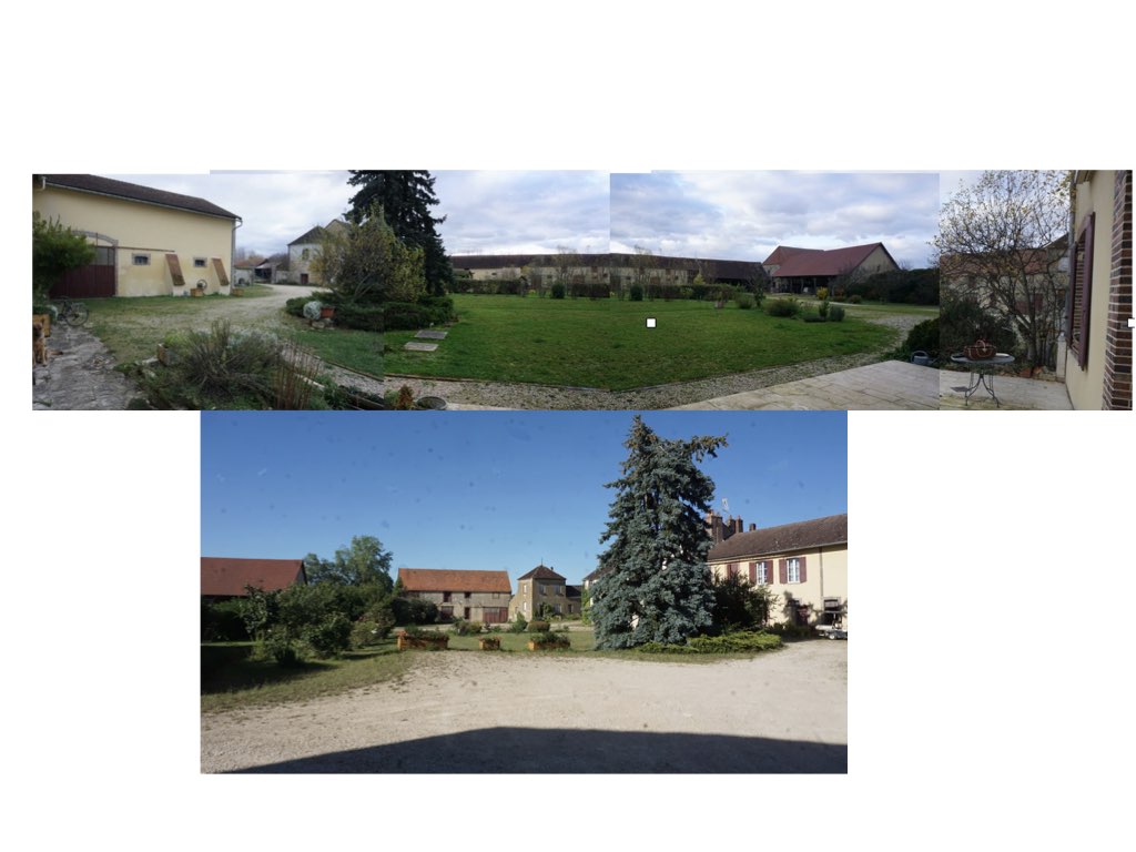 – ligne du bas : vue du grand marronnier et du pavillon puis la maison de la ferme avec dans l’angle la vieille grange puis retour vers le porche